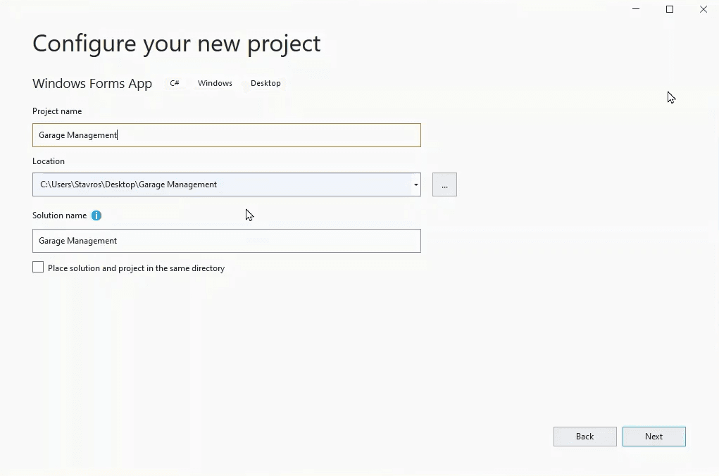 Δίνουμε το όνομα στο project μας και επιλέγουμε που θα το αποθηκεύσουμε.